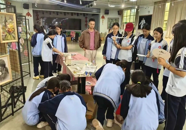 活动现场特别设置漆扇手工现场制作环节,由秀屿美育中心的专业教师现场指导学生创作。该环节将漆艺等非物质文化遗产融入校园教育实践,让学生近距离接触传统工艺,通过亲手设计、制作漆扇,深入理解传统纹样的文化内涵与色彩美学的独特魅力,在实践中感受传统文化的博大精深,有效推动了非物质文化遗产的校园传承与创新发展。