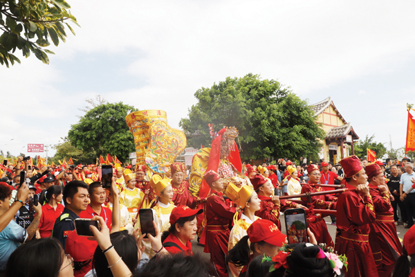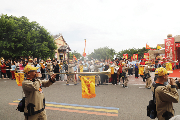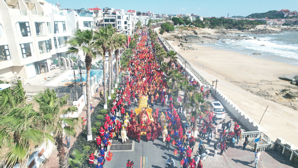 由两岸非遗民俗阵头组成的巡安队伍从祖庙出发,长长的队伍犹如一条巨龙,沿着祖庙西轴线大牌坊、朝宫街、金海岸沙滩等既定路线行进,踩街队伍所经之处,吸引了成千上万海内外妈祖敬仰者、游客夹道欢迎。