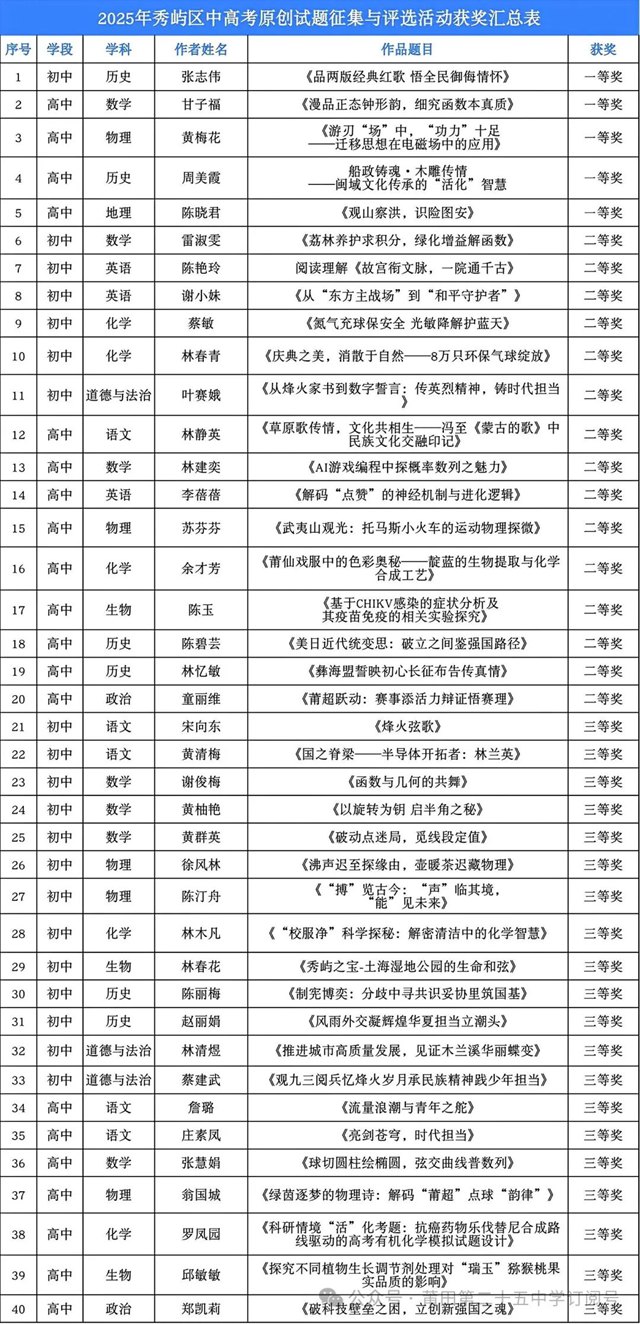 在“2025年莆田市秀屿区中高考原创试题征集与评选活动”中,莆田第二十五中学教师精心命制的原创试题,以其前瞻性、科学性与规范性,荣获5个一等奖、15个二等奖、20个三等奖,彰显了该校在教学研究与备考指导方面的强大实力。