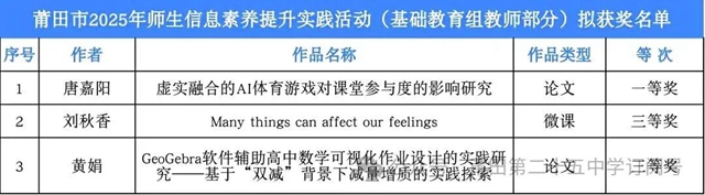 在“2025年莆田市师生信息素养提升实践活动(基础教育组教师部分)”中,该校教师的作品巧妙融合信息技术与课堂教学,夺得1个一等奖、2个三等奖,充分展现了该校教师在教育信息化浪潮中的探索精神与实践能力。