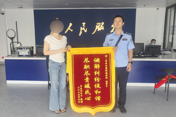 刘庆一的“成长答卷”远不止于此。上个月,辖区内一对房东和租客因家具损坏和物业费问题闹到派出所。刘庆一前后跑了两三趟,一边听他们倒苦水,一边慢慢讲道理、算明白账,最终促成双方达成一致,当场结清了费用。两天后,房东特意送来了一面锦旗,上面写着“调解纠纷促和谐 尽职尽责暖民心”。