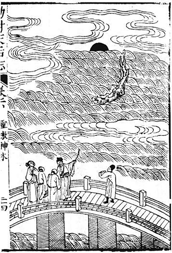 清代《天后圣母事迹图志》《天后圣母圣迹图志》中“明前迹复现神槎”同载:“莆东宁海桥头,众方渡,见光中缥渺(缈)浮一古木,其状绝异,顺流而前,人莫之识。至夕,乡人得梦,知当年显应神槎云。”工笔重彩画与木刻版画虽构图各异,但画中的云海、神灵与人物彼此呼应,共同生动地刻画了宁海桥的独特地理风貌——此处溪海交汇,洪潮顶托,以致水势湍急、泥沙滚滚。这种精湛的描绘,赋予了“莆东宁海桥头”极强的真实感与临场感,令读者仿佛身临其境。