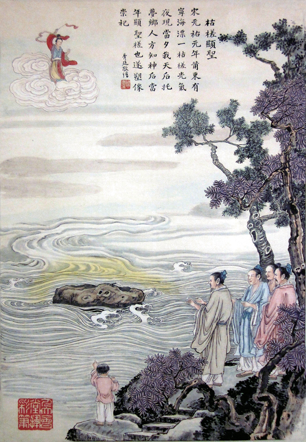 清代《天后圣母圣迹图志》中“泛枯楂重新圣像”载:“宋哲宗元祐元年,丙寅。莆东有墩常现光,迹之,一枯楂也。渔人拾之归,楂自还故处。再试亦然。乡人获梦,知楂为神所凭。言传,制干李公闻之,募建庙,号为‘圣墩’。”渔民怀疑有异常的宝贝,就去侦察、窥视,原来是海水漂来的一块枯木在发光。打鱼人拾它放在家中。第二天早晨去看,枯木自己已经回到原来的地方。再试验一次,依然是这样。当晚妈祖给宁海墩乡里的人托梦,说是湄洲神女,那块木头是其所寄托的,应该祀祭她,就会赐给人们幸福。与图志版画布局相似的现代《周秀廷妈祖故事画册》“枯槎显圣”中,图题表明了莆东宁海墩“当年圣显槎也”,为妈祖建庙塑像及赐额崇祀的第一次正式记录,距其仙逝恰满百年。