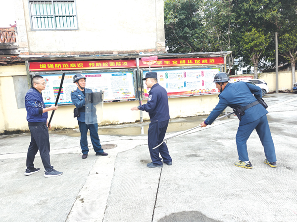 期间,民警围绕校园暴力、突发闯入等常见安全风险,系统讲解“最小应急单元”的建设意义、职责分工,以及应对突发暴力伤害、组织密集场所疏散等关键流程,让学校安保人员明确“什么情况该做什么、该怎么做”。随后,民警逐一演示了防暴盾牌的防护姿势与移动配合技巧,防暴钢叉的瞄准、限制及控制要领,以及防暴棍的标准使用方法,指导保安队员们如何利用器械形成防御阵型,如何在不同情境下有效制止不法侵害、控制现场事态。