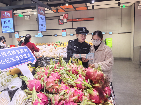 本报讯 2月15日上午,城厢公安分局充分利用节前居民采购年货的有利时机,在城厢区华亭镇镇中心超市组织开展“禁毒宣传进超市 守护居民菜篮子”主题宣传活动。活动现场,民警通过设立咨询台、展示仿真毒品模型、发放禁毒宣传资料和主题气球等多种形式,向过往购物群众和周边居民普及毒品的种类、危害及防范知识。针对当前春季禁种铲毒的关键节点,民警创新宣传方式,在超市人流量密集的果蔬摊位区域精心设置了禁种宣传标语,引导群众自觉抵制非法种植行为,将禁毒知识送到群众身边,营造全民参与禁毒的浓厚氛围。(蔡进佳)