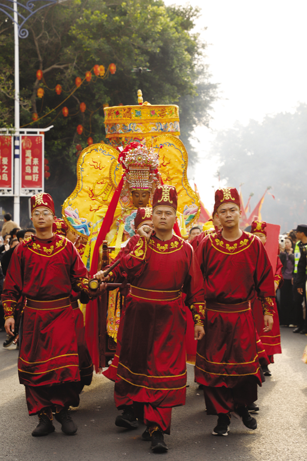 24日上午9时58分,湄洲妈祖祖庙现场锣鼓铿锵、人潮如织,浓浓的元宵年味扑面而来。两岸妈祖敬仰者怀着无比崇敬的心情,共同参与妈祖金身起驾仪式。天后宫内,祖庙董事会董事长林金赞偕祖庙全体董监事、值年福首及在岛的台湾乡亲代表一道,行三献礼,恭请妈祖金身起驾出巡。