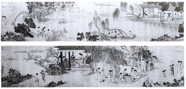 明末黄卷仕女画风格鲜明,其作品在内容选择上更为多样,常借执扇、悠思、凭栏、倚窗等人物姿态,传达对当时社会女性地位与命运的关注与思考。题材涵盖世俗生活、平民女子,亦不乏文学小说中的美人形象,笔致秀逸,形态各异,形神兼备。作品形式丰富,多为各地博物院所藏。《纺授堂诗文集》中曾异撰《黄圣谟绘事寄,将诗以答之》言:“圣谟今之古人也,有时大抺时细写。予也学之为文章,细笔嫌媚纵嫌野。所以逐队五十余,犹是沦落不遇者。谁能似尔意所之,涂朱能淡墨能冶。宫闺清庙明堂间,国风三颂小大雅。或云天纵笔妙丽,能事肯以颜色假。我今十倍买胭脂,涂成牡丹颜渥赭。风雪十日悬市中,满城策蹇梅树下。”据载,作于明崇祯九年(1639)的《嬉春图》卷,绢本设色,纵38厘米,横311.2厘米,上海博物院收藏。作者匠心独具,有意识地追求画面结构的空间完整性,将其打造为一个由浮桥、植物、建筑、船舫及仕女活动共同构成的世界。画中将春季古代女性活动综合于开放的环境之中,地景、植被、建筑、气候与各色人物、活动共同构成野外的空间,形成一个人造世界。同时,依照明代江南的自然景色与人物审美标准,作者创造了一个具有“自我意识”的女性空间,神形逼真,妙意横生,内含会所结构与游园系统,足见其景观设计才能。诚然,以手卷的艺术形式呈现春天气息,需要观者置于桌上,用双手把握。画面中仕女们在相互联系的各个空间单元内展开活动,或游乐,或访友,或抚琴,或采花,层次清晰,意趣盎然。人物造型惟妙惟肖,展现出仕女的精神风貌与内心情感,引人感念,别具匠心。更为重要的是,此手卷风格趋于艳丽、细腻,尤其在人物造型与服饰描绘上尤为精致入微。同时,受文学化思想的影响,明代仕女画在人物刻画上多呈现出“点景式”的叙事情节,进一步增强了画面的艺术感染力。