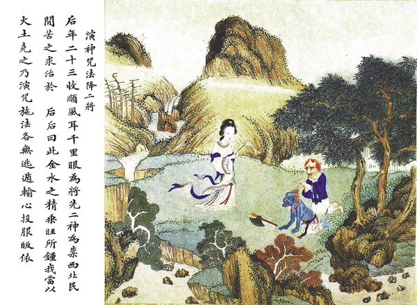 与《天后显圣故事图轴》相比,清代《天后圣母事迹图志》“演神咒法降二将”中背景以溪泉石涧为伴,妈祖手持拂尘,施展神咒,以火土降伏二怪。将妈祖与二怪置于同一视觉平面,弱化了其神性的一面,却让她显得更亲切更具人性光辉。其以居中取势法来组织画面,采用半工半写的表现形式。妈祖右手举拂尘,唇畔微启,似在说着什么,描绘得生动有趣。