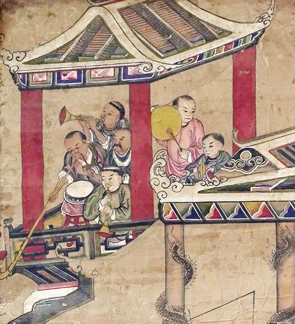 画中乐师围聚奏乐、乡民凝神聆听、孩童好奇张望的细节,更生动复刻了十音八乐融入莆田民间生活的真实场景,让这一非遗技艺从文字记载走向具象呈现。这幅珍贵的文物古画,既是研究清代莆田民间器乐、民俗仪式的一手核心视觉资料,也是破译莆仙乐舞文化传承脉络的关键凭证。