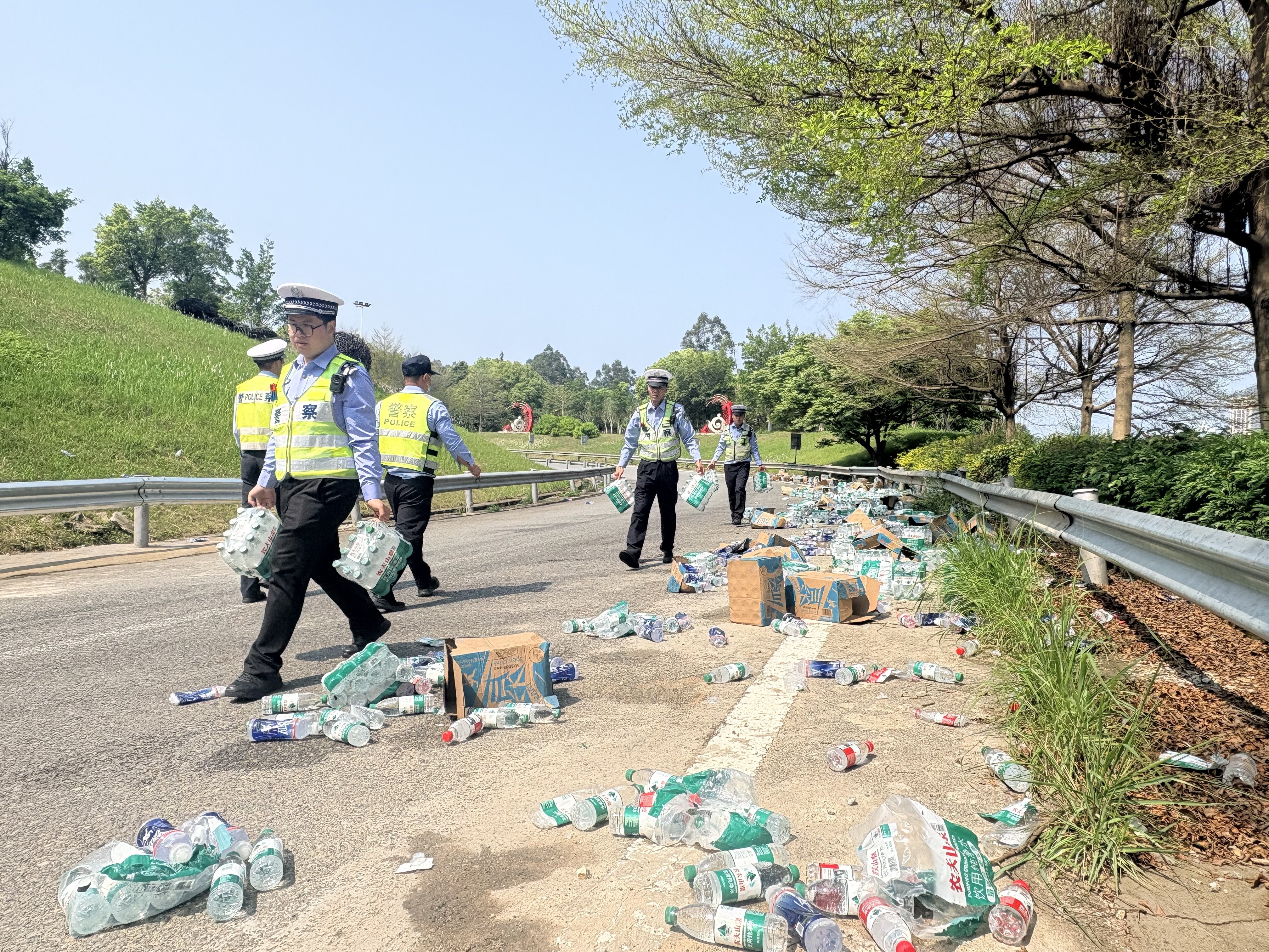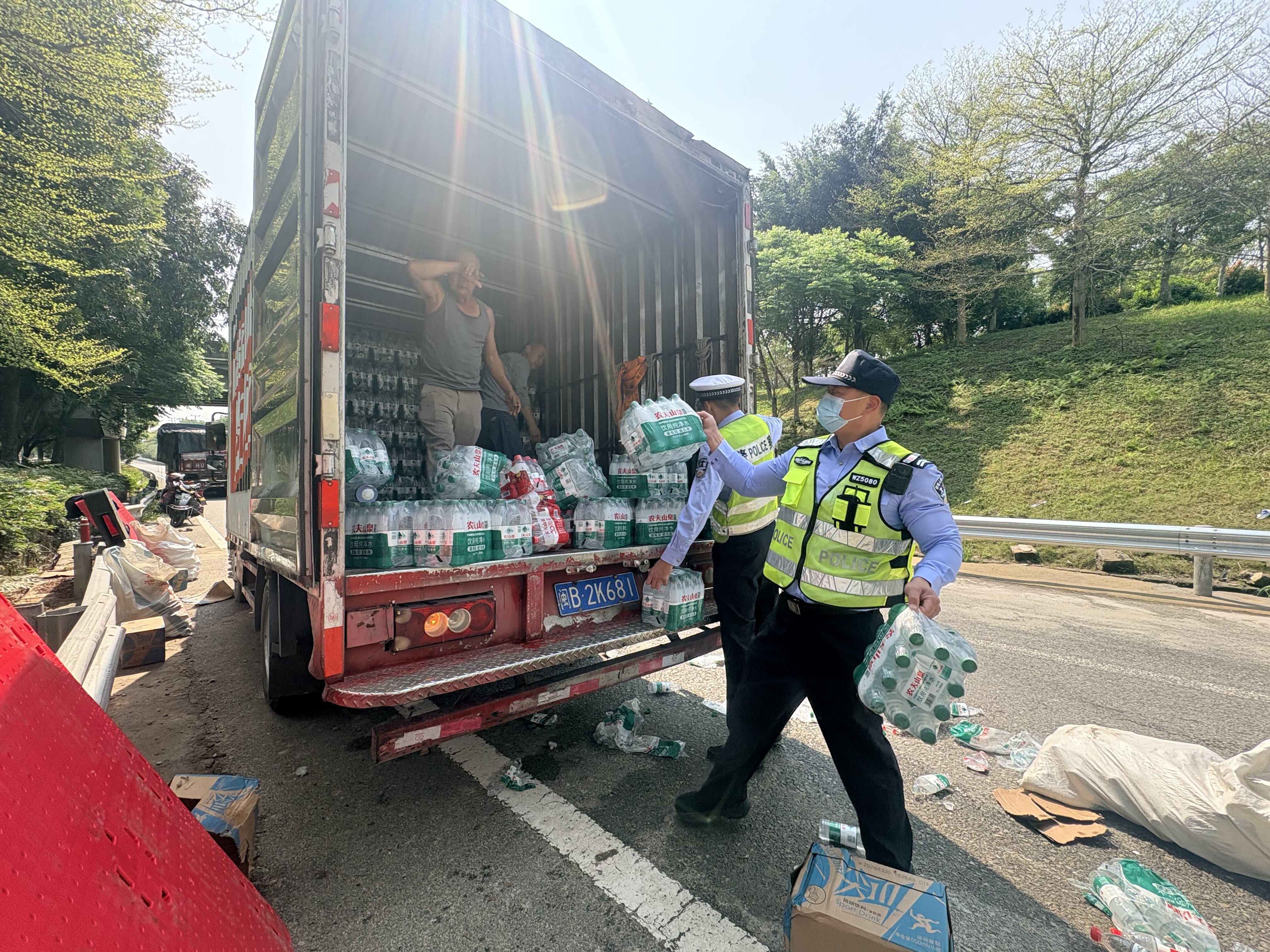 本报讯 4月9日上午6时14分许,在仙港大道发生货车货物侧翻事故,车上装载的矿泉水、尖叫等饮品大量散落路面,影响通行的同时还存在安全隐患。当日10时许,仙游县公安局交管大队城关中队正在开展交通违法查纠,发现对向车道的货车情况,立即停止查纠前去帮忙。一面指挥疏导车辆有序通行,防止发生交通事故,一面全力帮助货车司机一起清理散落的货物,并协助司机把货物重新装载到车上。经过一个多小时的奋战,在城关交管中队9位民辅警的帮助下,终于将散落的货物全部搬回上车。