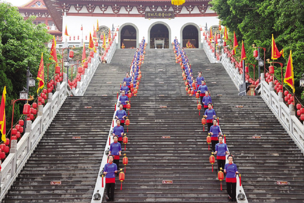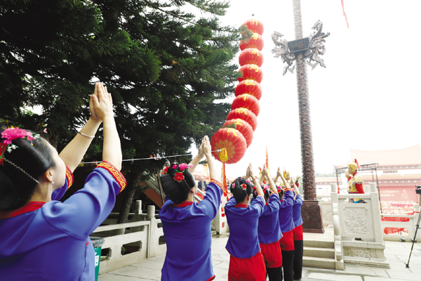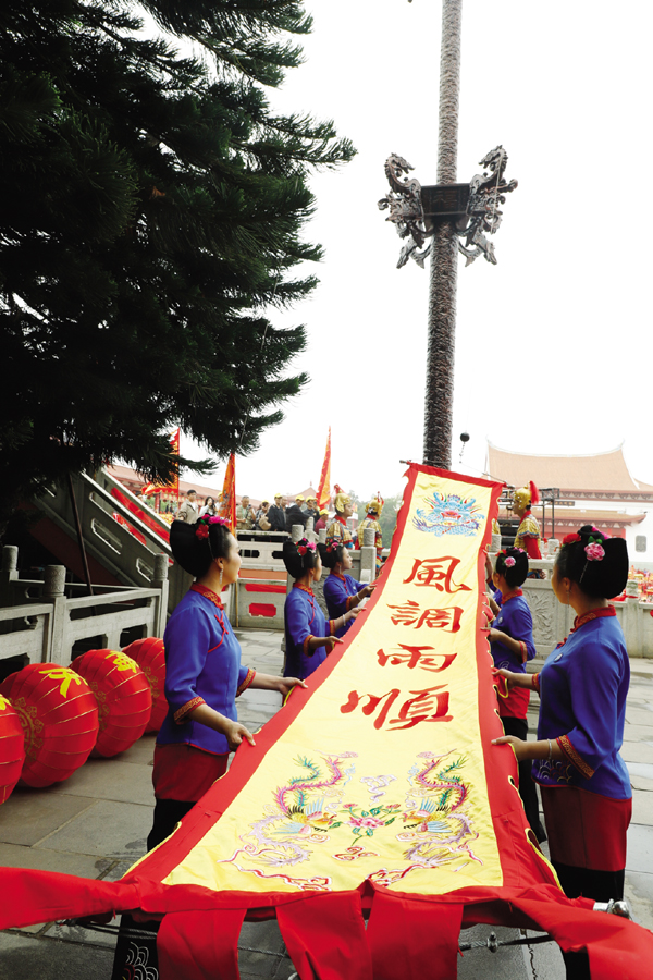 “升幡庆妈祖千秋圣诞,挂灯引黎民万里慈航”。当天上午,庄严肃穆的“升幡挂灯”仪式在天后广场举行。身着特色服饰的护幡湄洲女、升幡手、挂灯手、号手伴随着悠扬的《妈祖》乐曲声,依次就位,在现场海内外嘉宾和妈祖敬仰者的注视下,两面幡旗和18盏红灯从铸铜飞凤旗杆缓缓升起,在天后广场上空迎风摇曳。