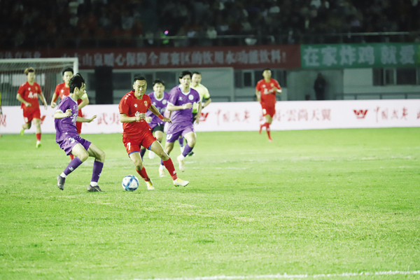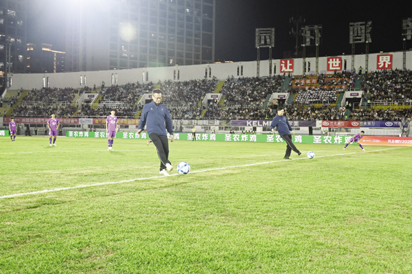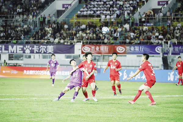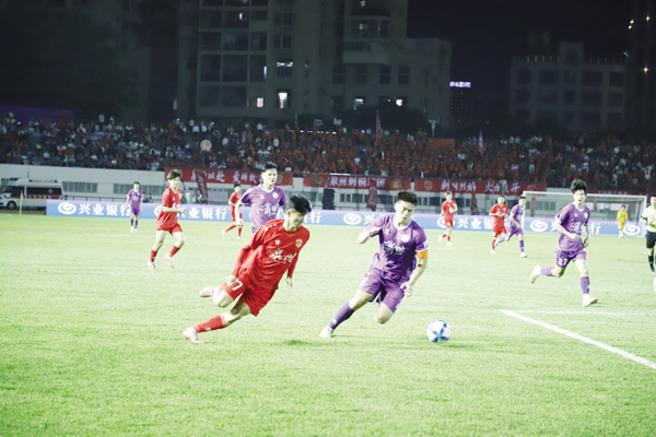 当晚,市体育中心体育场座无虚席,球迷们手持助威道具,为双方球队呐喊鼓劲,现场气氛热烈。绿茵场上,双方你来我往、攻防交错,每一次精彩的传球、射门、扑救,都引得现场球迷阵阵欢呼。现场MC全程播报赛事进程,实时造势带动全场氛围,纸吹雪漫天飞舞,紫色的助威浪潮席卷赛场,将主场的热情推向一个又一个高潮。