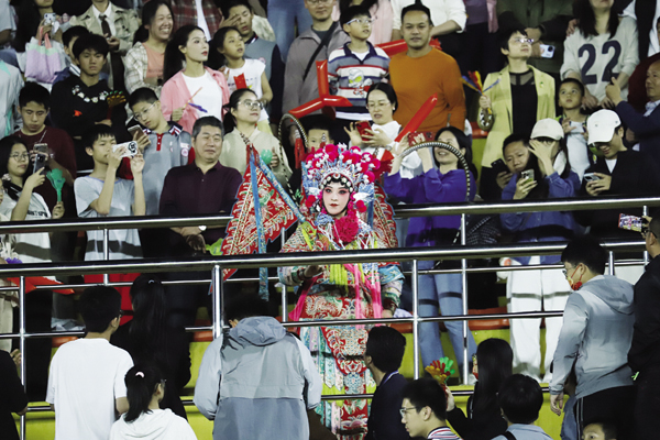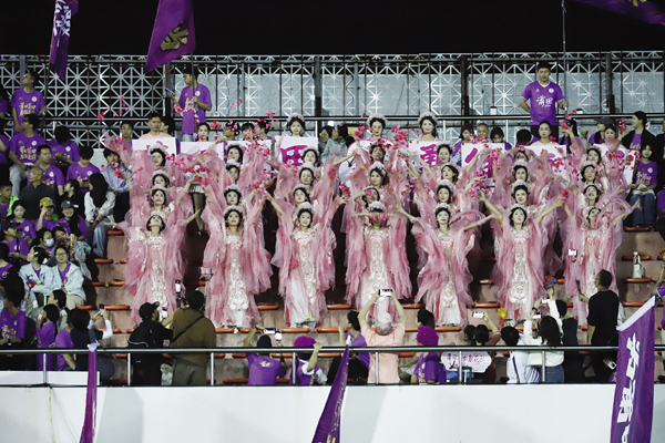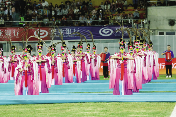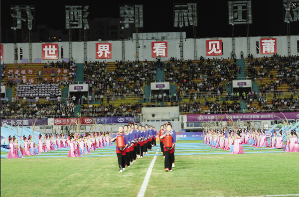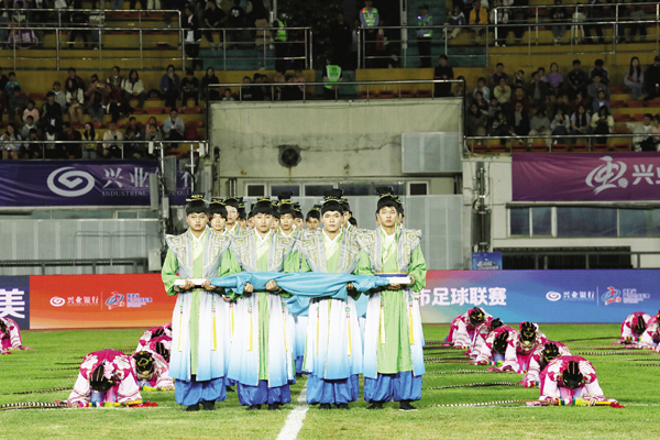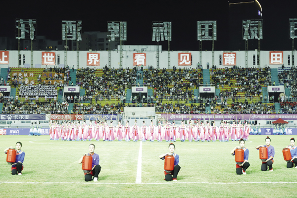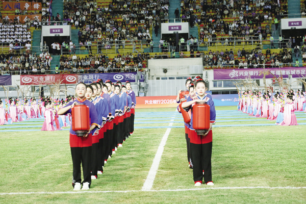 为丰富赛事体验,赛事现场特别设置了多元暖场环节。DJ秀《爱拼会赢 崛起闽中》燃动全场,大型表演《大爱妈祖》改编自国家级非物质文化遗产——妈祖祭典中的乐舞,气势恢宏,以舞为媒,凸显“大爱妈祖”元素。莆仙戏快闪节目《木兰传福》引爆全场,以莆仙戏刀马旦“挂帅点将”为魂,联动东、南、西、北各区球迷,通过戏曲传报、把子功展示,营造激情对垒氛围,再无缝切换至万人合唱《歌唱祖国》,让非遗文化与足球激情同屏共振。