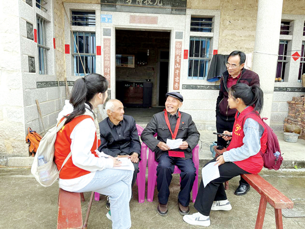 图为东坪村革命“五老”兄弟林步章(左)、林焕章(右)向莆田学院“时光小分队”志愿者讲述红色故事。 龙佳欣/摄 清明前夕,在仙游县最南端的革命老区基点村东坪村三台龙3号,莆田学院“时光小分队”的志愿者们见到了中共闽中工委三台龙交通站负责人林兜(1896.2—1984.11)…
