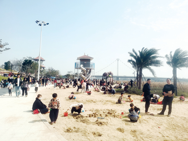 本报讯 春节以来,莆田玉湖新城木兰溪畔新建的滩地公园成为一处市民的网红打卡地,这里沙滩上新建的塑胶游乐场,包括儿童秋千、儿童滑梯、儿童健身组合等儿童设施的投用,形成一座其乐融融的“儿童乐园”,孩子们在滑梯、秋千间玩得不亦乐乎,而在沙滩上,家长陪伴着孩子做玩沙…