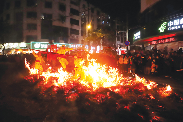本报讯 2月13日(农历正月十六),城厢区凤凰山街道筱塘社区举行一年一度“摆棕轿跳火”庆元宵活动。表演者抬着棕轿,随着锣鼓的节拍,一次又一次地跳过熊熊燃烧的火堆,赢得了现场围观群众的一声声惊呼与呐喊,“跳火”也被人们形象地称“火上芭蕾”,是莆田闹元宵最有特色民…