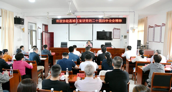 沈萌芽为部分市、区政协委员和荔城区政协机关干部、乡镇联络组组长宣讲党的二十届四中全会精神,并实地调研后黄社区农村水塘活化利用、新农人直播基地、共富工坊等项目,详细了解村民创业及镇街政协联络组建设情况。