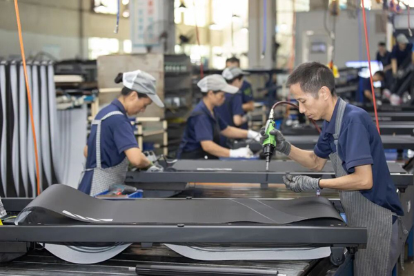 2025年9月12日,福建晋江一家体育器材工厂的工人在车间流水线上组装跑步机。新华社发(连静毅 摄)