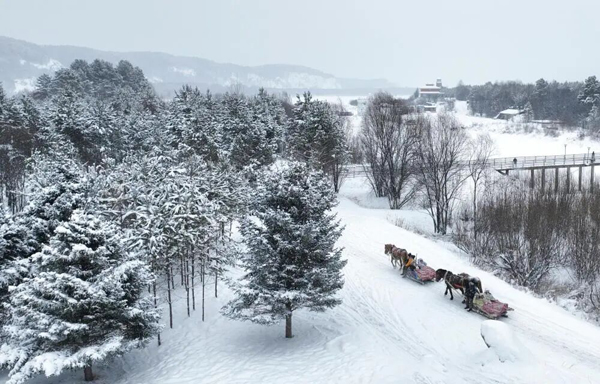 2024年11月27日,游客在黑龙江省漠河市北极村体验马拉爬犁项目(无人机照片)。新华社发(徐率 摄)