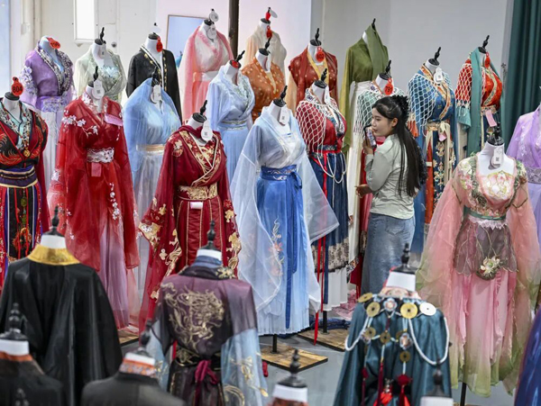 2025年6月17日,在山东省菏泽市曹县有爱云仓汉服基地,工作人员直播推介汉服。新华社记者 徐嘉懿 摄