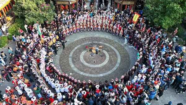 2024年11月30日,侗族群众在贵州省黔东南苗族侗族自治州黎平县肇兴侗寨进行文艺表演(无人机照片)。新华社发(王纯亮 摄)