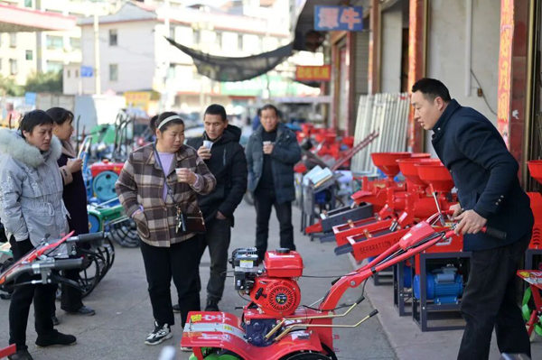 2025年2月9日,在湖南省娄底市双峰县农机市场,农户在选购小农机。新华社发(李建新 摄)