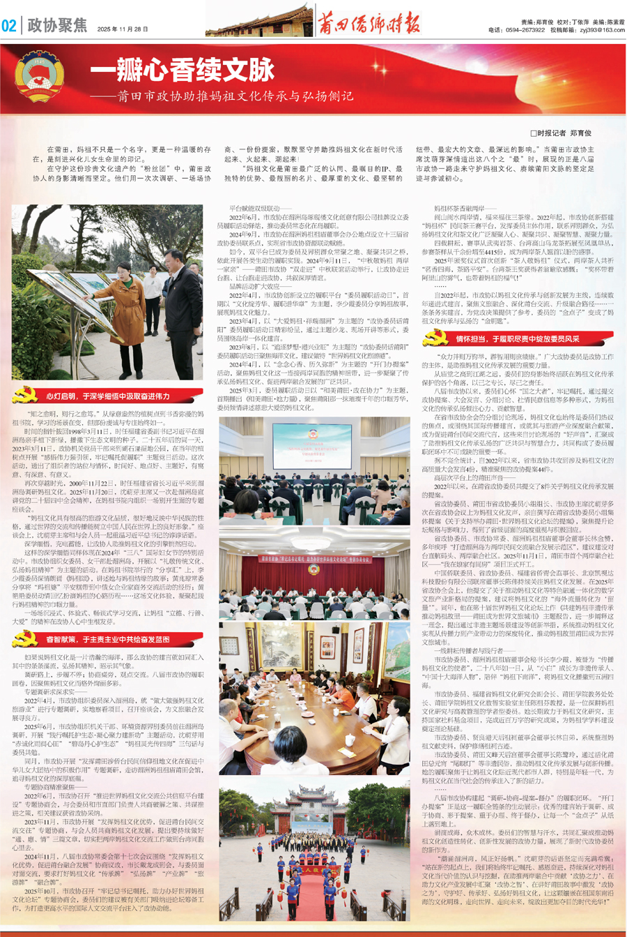 如果说妈祖文化是一片浩瀚的海洋,那么政协的建言就如同汇入其中的条条溪流,弘扬其精神,昭示其气象。 调研路上,步履不停;协商桌旁,观点交流。八届市政协的履职画卷,因聚焦妈祖文化而格外绚丽多彩。 专题调研求深求实—— 2022年4月,市政协组织委员深入湄洲岛,就“做大做强妈祖文化旅游业”进行专题调研,实地察看项目,召开座谈会,为文旅融合发展寻良方。 2025年6月,市政协组织机关干部、环境资源界别委员前往湄洲岛调研,开展“践行嘱托护生态·凝心聚力建新功”主题活动,沈萌芽用“赤诚化雨润心田”“碧岛丹心护生态”“妈祖灵光传四海”三句话与委员共勉。 同月,市政协开展“发挥莆田涉侨台民间信仰祖地文化在促进中华儿女大团结中的积极作用”专题调研,走访湄洲妈祖祖庙莆田会馆,追寻妈祖文化的深厚底蕴。 专题协商精准聚焦—— 2022年6月,市政协召开“推进世界妈祖文化交流公共信息平台建设”专题协商会,与会委员和市直部门负责人共商破解之策、共谋推进之策,相关建议获省政协采纳。 2023年11月,市政协开展“发挥妈祖文化优势,促进莆台民间交流交往”专题协商,与会人员共商妈祖文化发展,提出要持续做好“通、惠、情”三篇文章,切实把两岸妈祖文化交流工作做到台湾同胞心里去。 2024年11月,八届市政协常委会第十七次会议围绕“发挥妈祖文化优势,促进莆台融合发展”协商议政,市长戴龙成到会,与委员面对面交流,要求打好妈祖文化“传承牌”“弘扬牌”“产业牌”“旅游牌”“融合牌”。 2025年10月,市政协召开“牢记总书记嘱托,助力办好世界妈祖文化论坛”专题协商会,委员们的建议被有关部门吸纳进论坛筹备工作,为打造更高水平的国际人文交流平台注入了政协动能。 平台赋能双级联动—— 2022年6月,市政协在湄洲岛琢砚楼文化创意有限公司挂牌设立委员履职活动驿站,推动委员常态化在岛履职。 2024年9月,市政协在湄洲妈祖祖庙董事会办公地点设立十三届省政协委员联系点,实现省市政协资源联动赋能。 如今,双平台已成为委员及界别群众常聚之地、凝聚共识之桥,依此开展各类生动的履职实践。2024年9月11日,“中秋敬妈祖 两岸一家亲”——莆田市政协“双走进”中秋联谊活动举行,让政协走进台胞、让台胞走进政协,共叙深厚情谊。 品牌活动扩大效应—— 2022年4月,市政协创新设立的履职平台“委员履职活动日”,首期以“文化绽芳华、履职谱华章”为主题,李少霞委员分享妈祖故事,展现妈祖文化魅力。 2023年4月,以“大爱妈祖·祥瑞湄洲”为主题的“政协委员话莆阳”委员履职活动日精彩纷呈,通过主题沙龙、现场开讲等形式,委员围绕岛岸一体化建言。 2023年8月,以“追逐梦想·港兴业旺”为主题的“政协委员话莆阳”委员履职活动日聚焦海洋文化,建议做特“世界妈祖文化旅游港”。 2024年4月,以“念念心香、历久弥新”为主题的“开门办提案”活动,聚焦妈祖文化这一连接两岸同胞的精神纽带,进一步凝聚了传承弘扬妈祖文化、促进两岸融合发展的广泛共识。 2025年3月,委员履职活动日以“和美莆田·政在协力”为主题,首期播出《和美莆田·她力量》,聚焦莆阳那一抹璀璨千年的巾帼芳华,委员倾情讲述慈悲大爱的妈祖文化。 妈祖杯茶香融两岸—— 闽山闽水两岸情,福来福往三茶缘。2022年起,市政协创新搭建“妈祖杯”民间茶王赛平台,发挥委员主体作用,联系界别群众,为弘扬妈祖文化和茶文化广泛凝聚人心、凝聚共识、凝聚智慧、凝聚力量。 四载耕耘,赛事从武夷岩茶、台湾高山乌龙茶拓展至凤凰单丛,参赛茶样从千余份增至4415份,成为两岸茶人翘首以盼的盛事。 2025年颁奖仪式首次创新“茶人敬妈祖”仪式,两岸茶人共祈“茗香四海,茶路平安”。台湾茶王奖获得者翁瑜欣感慨:“奖杯带着阿里山的雾气,也带着妈祖的福气!” …… 自2022年起,市政协以妈祖文化传承与创新发展为主线,连续数年递进式建言,聚焦文旅融合、深化莆台交流、升级融合路径……一条条务实建言,为党政决策提供了参考,委员的“金点子”变成了妈祖文化传承与弘扬的“金钥匙”。