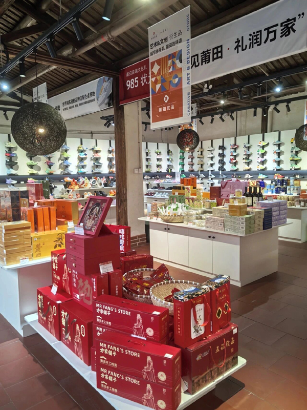 这家旗舰店有4间铺面、118平方米的单层空间,网罗了当地手工艺品、特色食品、妈祖文创和莆田鞋等。