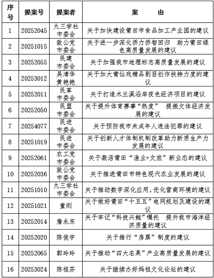 2025年以来,全市广大政协委员、政协各参加单位坚持以习近平新时代中国特色社会主义思想为指导,深入学习贯彻中共二十大及二十届历次全会精神,认真贯彻落实习近平总书记关于加强和改进人民政协工作的重要思想和对提案工作的重要指示精神,紧紧围绕市委“一五二三四”工作部署,聚焦莆田高质量发展首要任务,紧扣人民群众急难愁盼问题,以高度的政治责任感和历史使命感积极履职建言,形成了一批选题精准、调研深入、建议务实、成效明显的高质量提案,充分体现了新时代政协委员胸怀大局、心系民生的责任担当,展现了人民政协作为专门协商机构的独特优势。 根据《中国人民政治协商会议莆田市委员会提案工作细则》相关规定,经八届市政协第五十一次主席会议研究,决定对《关于加快建设莆田市食品加工产业园的建议》等16件2025年度好提案予以通报表扬(名单附后)。希望受到表扬的提案者珍惜荣誉、再接再厉,以更高标准深耕调研、精准建言,持续深化提案培育,提出更多有前瞻性、针对性、可操作性的高质量提案。 全市广大政协委员、政协各参加单位要以先进为榜样,聚焦“国之大者”、心系“民之关切”,切实把履职热情转化为履职实效,为奋力开创中国式现代化莆田实践新局面贡献政协智慧和力量。