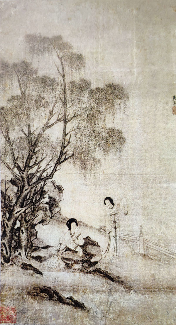 再如,辽宁鲁迅美术学院所藏黄卷《柳荫闲坐图》轴,画风工意结合。作者运用高古游丝描,线条流畅自如,细密绵长,悠缓自然。所绘两仕女一坐一立,或手执纨扇侧身而坐,若有所思,或正面而立,线条细柔,富有流动性,一笔直泻,劲健灵动。人物之神态及风韵,颇有仇英仕女画之遗意。正如《纺授堂诗文集》中曾异撰《赠黄圣谟有序》:“吾友莆田黄圣谟喜纵笔为山水,为余大写松石。其高连屋,下峙并础,殆欲振瓦而上。然世莫之知,多爱其图绘丽人也,歌以言之。黄圣谟,尔可谓英雄欺人,慢世而傲睨。尔谓磊砢鸿笔知者希,浓抹鈆华资游戏。譬则雄侠无奈何,自晦妇女饮醇醉。孙武奇兵莫用之,吴宫美人借小试。不可一世惠不恭,女子坐怀写高寄。倪迂洁癖图一丘,幼娥叩门鲁男闭。垓下之战大风歌,龙门雄笔舒意气。临邛当垆戚姫舞,有时点染亦琐细。奇人胸中无不有,剑槊香奁随所置。娟娟儿女得人怜,猛风喑哑趋而避。黄子乎,尔将遁世于山水之间,而滑稽于脏粉之队。吾老矣,于黄子之画方思学,为妇孺文章以逢世。”特别是以水墨意笔绘就大片柳荫,女主人闲坐于山石之上,逸情舒畅,足见作者的人物、山水兼长。通过柳树与磐石衬托出美人的闲情逸致,将仕女的形神与情景刻画得淋漓尽致。与唐代仕女造型的圆满大度有所不同,黄卷仕女画中惹人感念的美人体态呈现出一种羸弱的倾向,反映了当时社会的审美趣味。