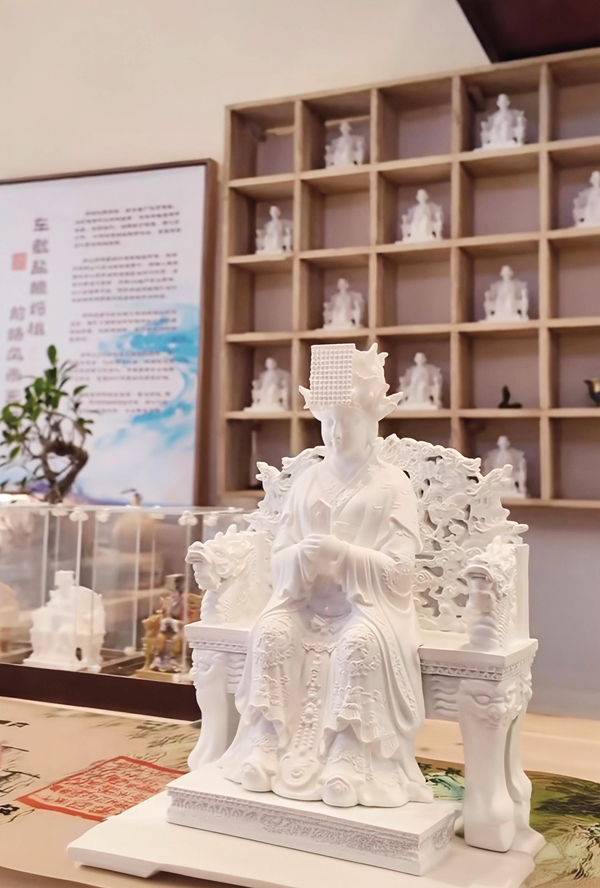 “海盐是大海的结晶,选用海盐塑造妈祖像,就是要将这两张千年非遗名片叠加,为‘妈祖故里 灵秀莆田’代言。”黄燕香告诉笔者,“我用湄洲湾纯净海盐,历时3年潜心雕琢,经28道严苛工序与900度高温淬炼,在2024年创作了全球首尊执圭盐雕妈祖像。2025年,又创作盐雕五福妈祖像。”