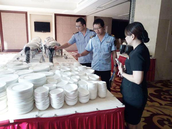 图为执法人员在海源国际酒店现场督导。 (梁怡清 田野)