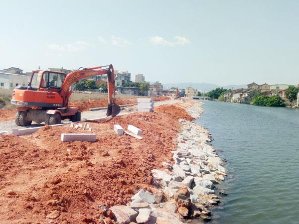 近日,记者跟随2017年中华环保世纪行(莆田)采访组,来到了位于涵江区白塘镇陈桥村的城涵河道(涵江段)园林景观及防洪改造工程(一期)现场,工人们正赶着抓紧推进绿道景观建设,抛石护岸、场地平整……虽然工程还未完工,但桥头总会有三三两两的村民前来健身,有的村民还会沿着平整的河堤走上一段,既锻炼了身体,也愉悦了心情。刚锻炼回来的陈大爷告诉记者,这里改造前两岸长满了杂草,环境差,也不安全。现在他们健身、游玩方便多了。