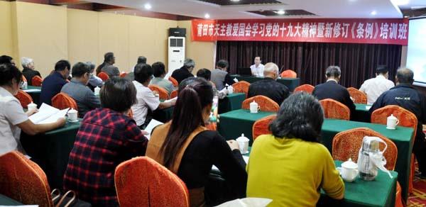 本报讯 10月25日,莆田市天主教爱国会举办学习中共十九大精神暨新修订《宗教事务条例》培训班,市、县区爱国会常委、神父、修女及各堂口负责人60人参加。会议传达学习贯彻中共十九大精神,邀请市民族宗教局副调研员黄祖洪作新修订《宗教事务条例》辅导讲座。与会学员认真学习党的十九大报告,一致认为报告气势宏大,催人奋进,表示要深入学习,领会精神实质,以实际行动为莆田发展营造和谐稳定的社会环境。市天主教爱国会副主任、秘书长林群华说,作为一名宗教界人士,要切实贯彻党的宗教工作基本方针,坚持我国宗教的中国化方向,积极引导宗教与社会主义社会相适应,坚决拥护中国共产党的领导,为社会的发展稳定和谐、全面建成小康社会、实现中华民族伟大复兴的中国梦作出应有的贡献。 (郑育俊 宋强)
