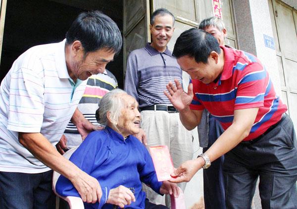 在重阳节即将来临之际,莆田市姓氏源流研究会曾氏委员的会长曾金洪,副会长曾天雄、秘书长曾金瑞、常务理事曾文兰,以及仙游县的宗亲曾尊耀副会长,曾海林副会长,曾永华理事,曾端清理事等有关工作人员,一日驱车二百多公里,先后度尾镇霞溪村、园庄镇枫林村、枫亭镇麟山村以及秀峰村的18位曾氏宗亲中90岁以上的老人,开展弘扬祖德,庆“九九重阳节”上门入户敬老访亲活动,向老人们送上关怀和节日的祝贺。