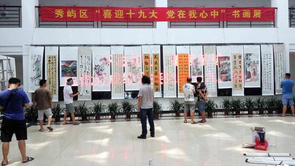 本报讯 日前,秀屿区举行“喜迎十九大 党在我心中”书画展。展出的近百幅作品,以艺术的形式表现了广大书画爱好者对党和国家的无比热爱,在翰墨挥洒中唱响时代主旋律,为党的十九大胜利召开献礼。图为干部群众在观看书画作品。 (林元标 陈峻山)