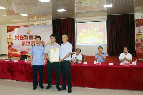 本报讯 10月16日,涵江区工商局在开展“服务企业发展 助力双创腾飞”主题党日。活动中,为涵江区电商产业管理服务有限公司颁发了全市首张“集群注册营业执照”,标志着我市企业集群注册登记管理服务新模式正式启动。