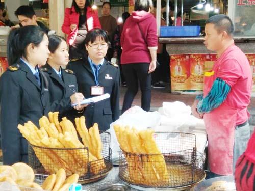 图为龙桥食药监所执法人员,在辖区市场早餐点检查油炸食品质量安全,同时,对现场油条、油饼进行监督抽检并认真做好现场笔录。 (舒易刚)