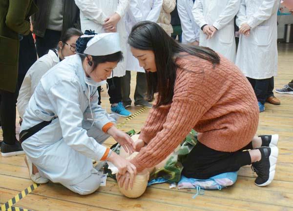 据介绍,为进一步改善医疗服务,莆田学院附属医院以“医院安全文化年”为契机,每个月安排多名急救专家,通过知识讲解、操作培训、模拟体验等形式,向广大市民普及心肺复苏等急救技能。