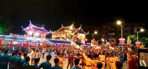 10月1日上午,秋高气爽,晴空万里。8点18分,参加巡安的两岸妈祖从萩芦灵慈宫起驾,当日中午驻驾延宁宫,当晚驻跸福莆仙东岳观,并举行隆重的驻跸庆典活动,其中就有精彩绝伦的省级“非遗”文化项目——“抛铁球”展演;10月2日,两岸妈祖驻驾新县文峰宫,当日傍晚回銮安座。