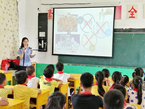 图为执法人员为小学生讲解食品安全知识。