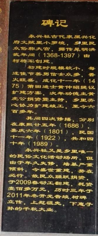 三、提议扩建走马亭村永兴社。永兴社古代隶属兴化府文赋里小罗境,乡里民众俗称大宫,据传是明洪武年间(1368-1397)由柯将军创建。初建时规模较小,每逢佳节善男信女众多,香火旺盛。成化十一年(1475),莆田进士黄仲昭提议扩建方案,次年功德主黄虎公捐资暨主持,乡里齐心协力扩建竣工,至今五百多年。其间四次修缮,分别在康熙廿五年(1686),嘉庆六年(1801),民国十一年(1922),共和四十年(1989)。后永兴社因年久失修,墙基严重倾斜,2009年乡民动工翻建,历时三年于2011年冬开光告竣。