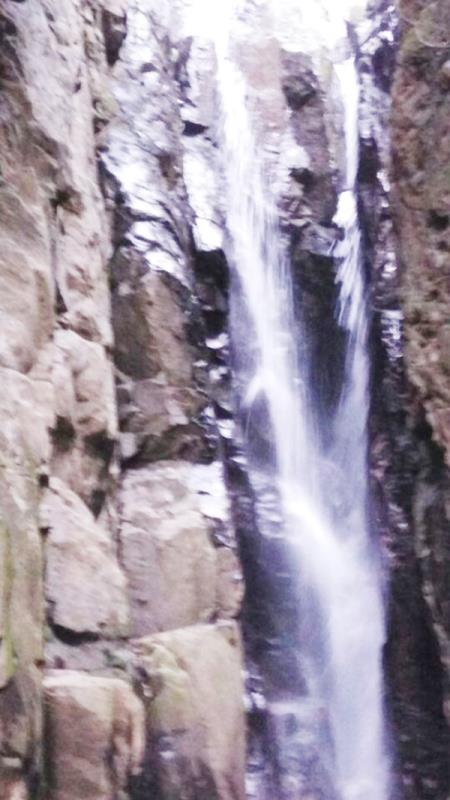 在我等使劲攀爬如同“天梯”山涧路中,路回路转,“到了到了,哗哗,听到了”。未见其瀑先闻其声。老远,我们就闻见有点惊天动地的咆哮声,一下子触动了疲劳的神经,兴奋起来。在一片带有原始神秘色彩的山崖上悬挂着一匹银白色的小飞瀑,争先恐后地直奔可谓“碧玉潭”的潭底,这股小瀑布似白练洁美,可喷珠吐玉,气势非凡,发出的声音也可是震耳欲聋的了。但见那率性而流的小瀑布在嶙峋的山石上欢畅飞溅的水珠,总是那么清澈、透亮,溅起的浪花晶莹剔透,就像跳动着赞美生命的音符。