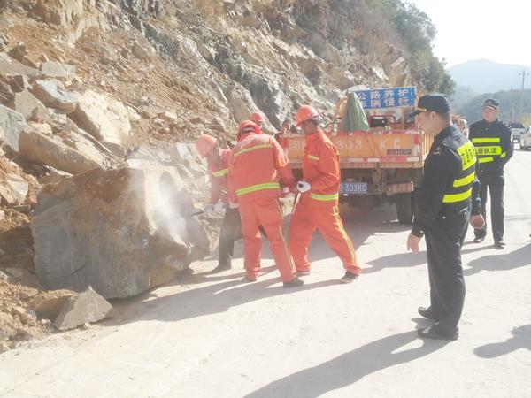 在现场路政人员在险情路段两侧进行维持交通秩序,并设置警示标志、安全桩等提醒过往车辆安全行驶;抢险队员利用铲车、碎石机等设置紧急处理泥土和落石,并将清理物用养护车运离现场。由于发现及时,路政人员和抢险队员配合娴熟,仅用了两个小时就抢通了该路段的交通。为防止山体上的落石再次滚落路段,抢险人员利用岩石破碎机对存在安全隐患的落石进行击碎处理。当日下午14时,抢险人员将该路段路面和水沟的溜方和落石全部清理干净,彻底恢复公路畅通。
