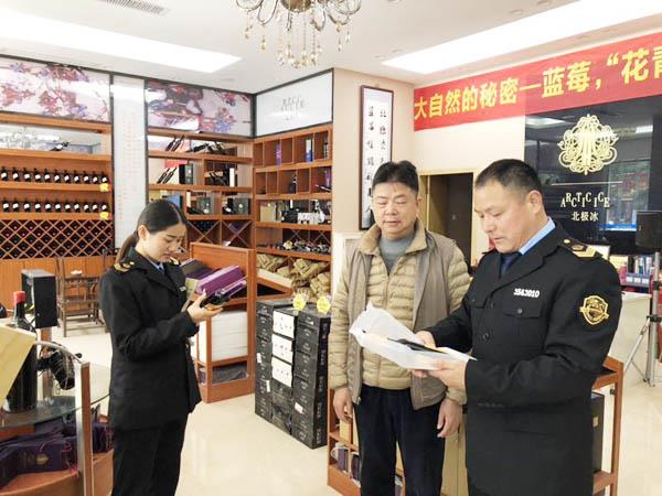 图为龙桥食药监所执法人员,在酒类产品质量安全专项整治检查现场,认真核查酒类产品的相关信息。