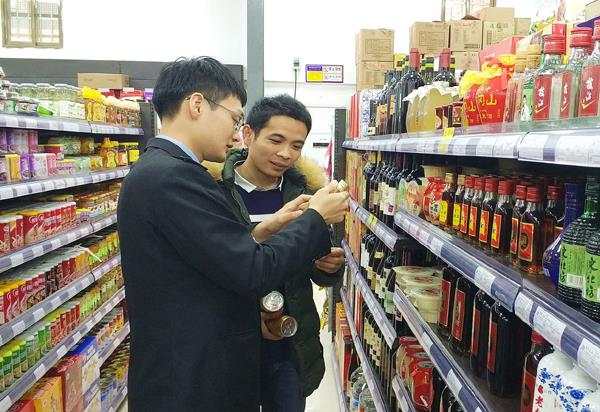 图为江口食药监所执法人员,在检查现场核对酒类产品相关信息,并指导经营者对假劣酒产品的识别。 (刘曌)