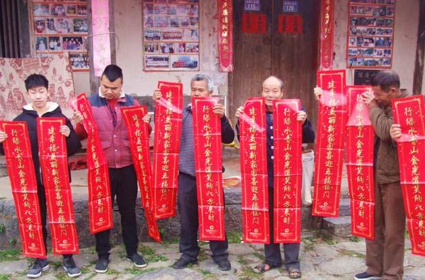 本报讯 建行送春联,歌颂新时代。近日,城厢区风办林桥村村民在家门口收到建行莆田分行营业所领导发来的春联,十分高兴。他们围在一起欣赏内容:建幸福美丽新家园喜迎五福临门;行绿水青山金光道笑纳八方来财。纷纷说,挂春联歌颂新时代真好! (陈宝柱)