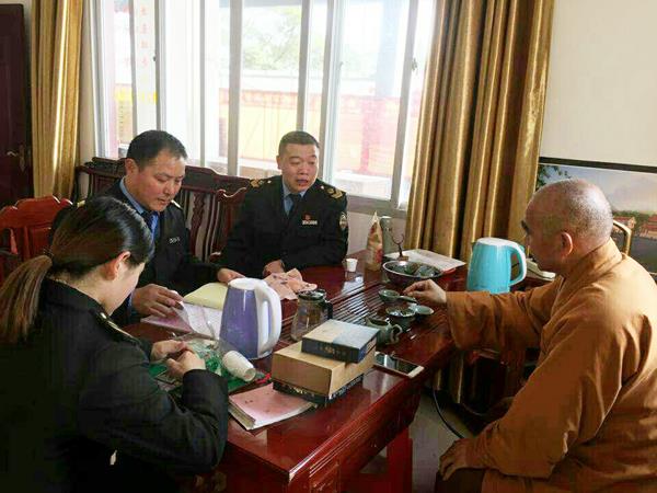 图为城厢区食药监分局陈军峰总监,龙桥食药监所工作人员就“佛事”活动期间食品安全工作,与石室岩寺妙敬主持进行深度对接。