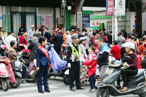 该大队提早谋划,科学调整警力部署,加强对校园及周边重点路段的交通管理,提高见警率,设立护学岗,确保校园周边道路安全、畅通、有序。当日,城厢交警大队联合中国移动通信公司组织安排人员提前半小时到达辖区筱塘小学附近主要路段和路口,采取定人、定岗、定路段,全力维护学校周边道路交通秩序。上下学期间学校门前路段及周边道路上车多、人多、接送孩子的家长多,道路变得拥挤不堪,伴随着清脆、响亮的哨声,交警们挥动手臂吹着哨子,指挥车辆有序通行。