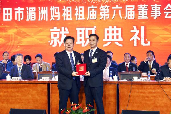 3月15日上午,湄洲妈祖祖庙董事会举行第六届第一次会员代表大会,并举行聘书颁发仪式。